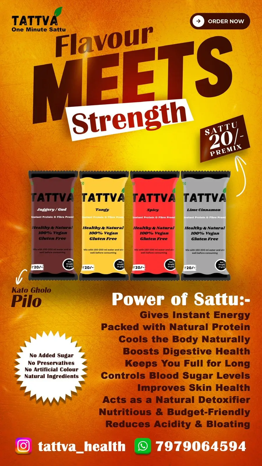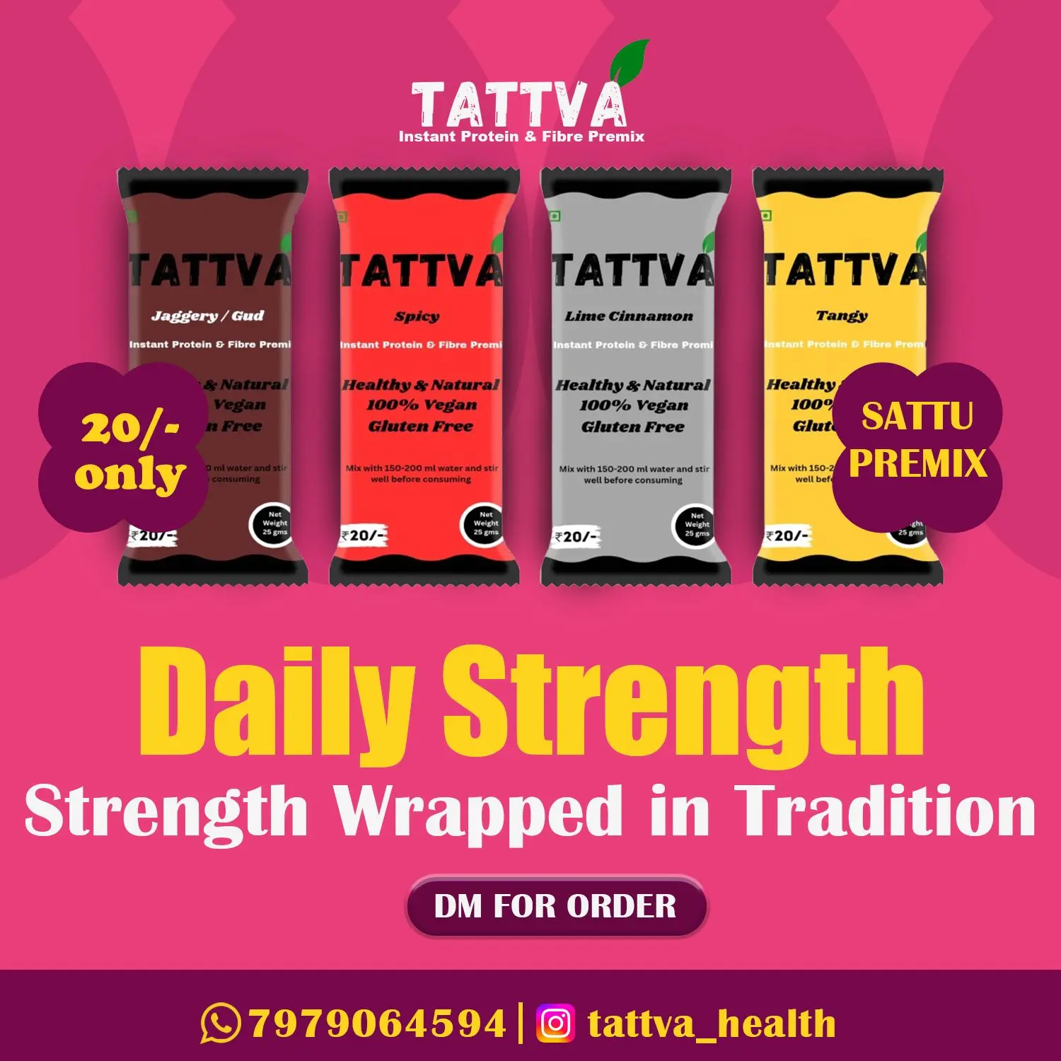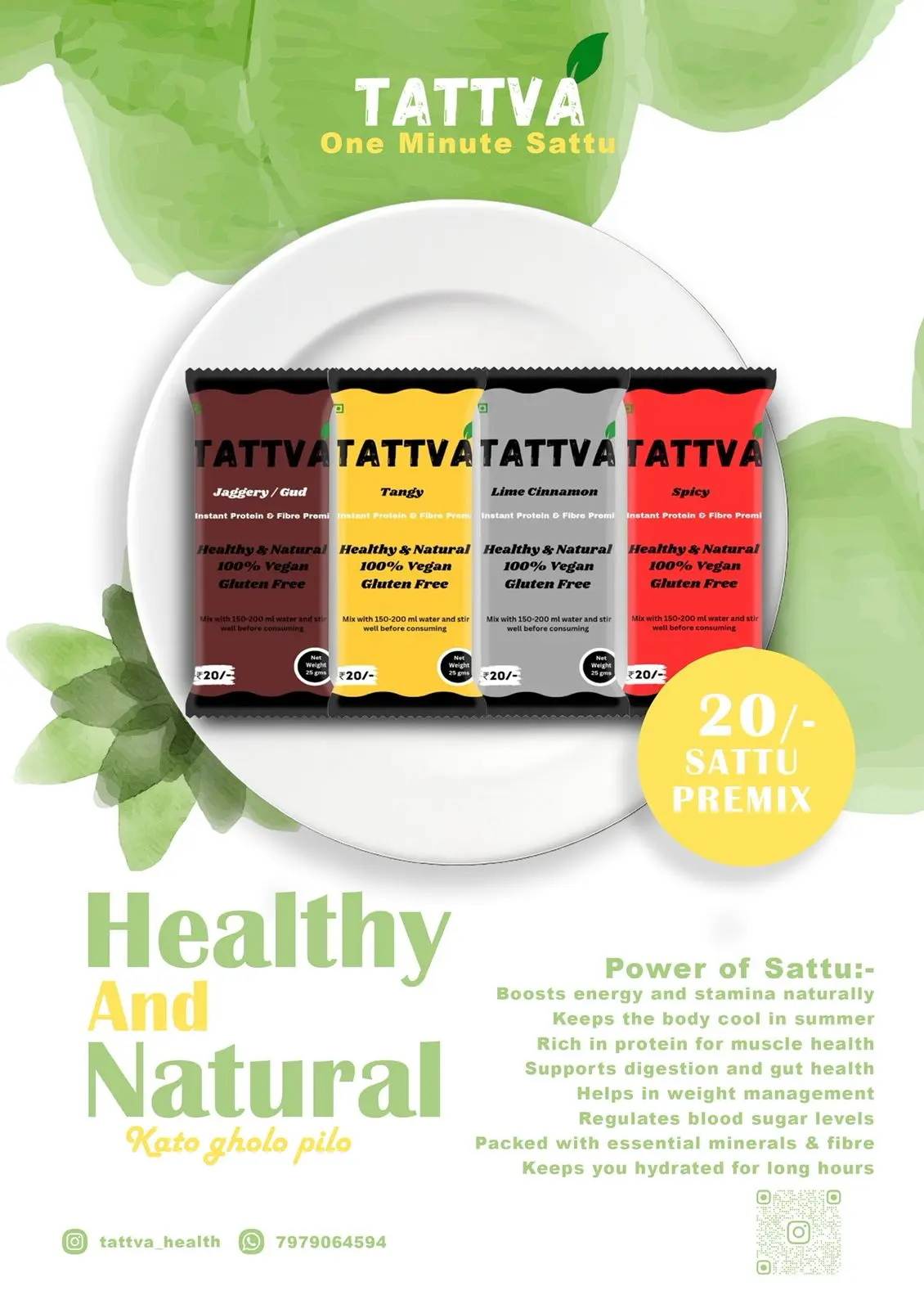 Tattva Health is a high-protein, high-fiber instant premix rooted in Indian tradition. It offers clean, plant-based nutrition that boosts energy, aids digestion, and keeps you full longer. Ideal for busy lifestyles, it’s a natural, cooling, and diabetic-friendly drink—perfect for daily wellness, anytime, anywhere.